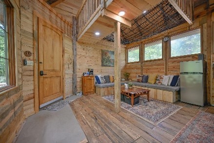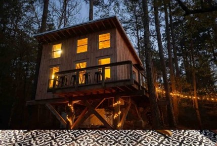 For overnight stays, Sacred Pines has a variety of accommodations, including a lodge, cabins, and tree houses. For events, the lakeside pavilion can hold up to 200 guests, or the event center can host 120 seated guests for indoor events.